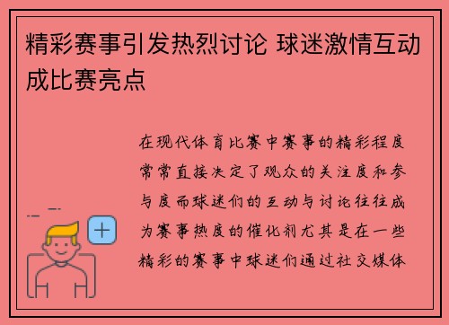 精彩赛事和球迷的热烈互动相辅相成,共同推动了体育赛事的热度和影响力。通过精彩的比赛内容,球迷们能够激发出强烈的讨论和互动,从而将赛事的氛围推向高潮。社交媒体等平台的多样化互动方式,为球迷提供了更广阔的参与空间,而球迷的反馈和讨论,也对赛事本身产生了积极的推动作用。