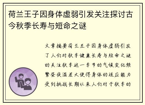 文章摘要:荷兰王子因身体虚弱引发了人们对秋季健康长寿与短命之谜的关注。秋季,这一季节的气候变化频繁,昼夜温差大,使得身体的适应能力受到挑战。长期以来,人们对于秋季的健康影响有着不同的看法,一些认为秋季是养生的好时机,有助于延长寿命,而另一些则认为秋季是生病的高发期,容易导致健康问题甚至早逝。荷兰王子的情况成为了探讨秋季长寿与短命的热点话题,尤其是在秋季的生理和心理影响、古今长寿文化的对比、现代医学对秋季养生的看法以及季节性疾病对身体的影响等方面,进一步引发了广泛的讨论。本文将从多个角度分析荷兰王子身体虚弱的事件,结合古今的长寿观念,探讨秋季对人的生理、心理和健康的影响,并寻求如何在秋季保持身体健康,从而提高长寿的几率。